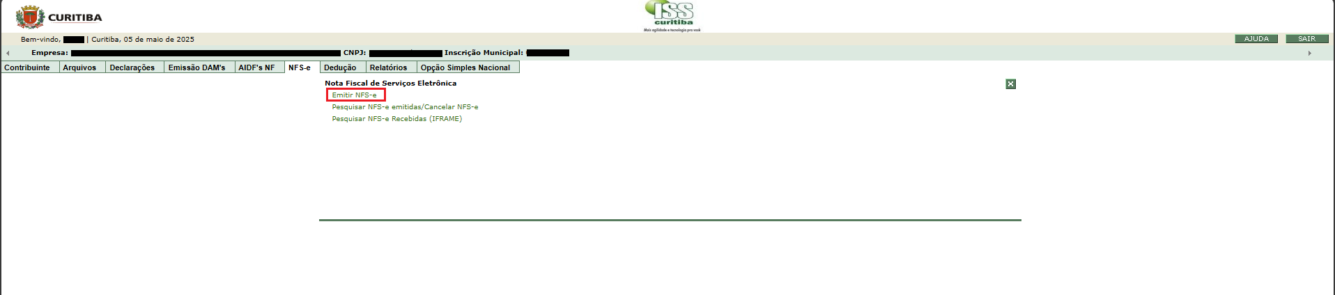 02) Clicar na opção NFS-e e então Emitir NFS-e:
