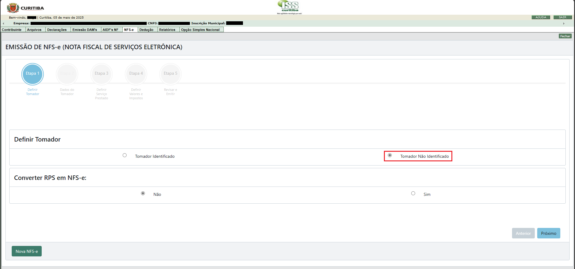 03) Como iremos emitir NFS-e para cliente no exterior, escolheremos a opção Tomador Não Identificado e clicaremos em Próximo: