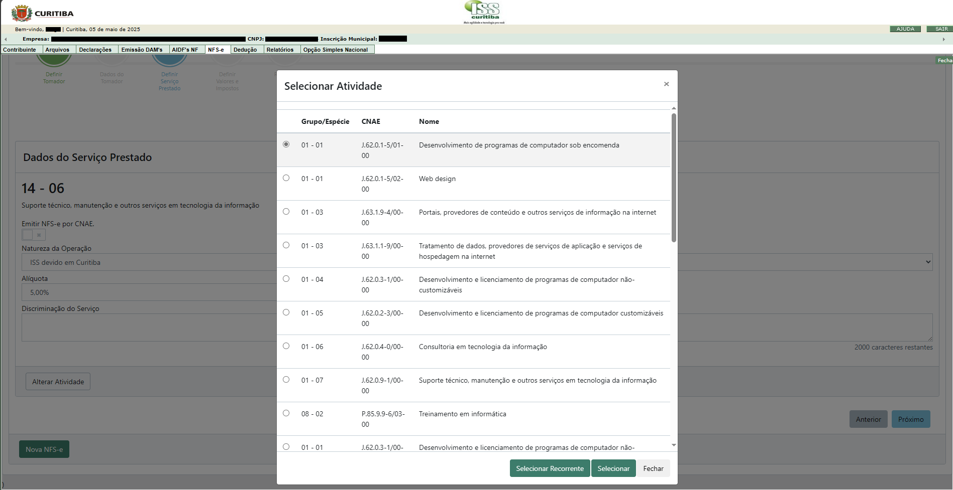05) Escolheremos a atividade desejada (caso tenha dúvidas, consulte a contabilidade sobre qual atividade utilizar, pois podem haver variações de tributação) e clicar em Selecionar (também pode ser clicado em Selecionar Recorrente para manter essa seleção para as próximas notas):