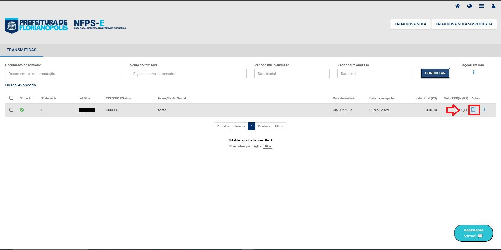 16- será exibida a lista com a nota emitida. Agora clique no ícone conforme a imagem abaixo.