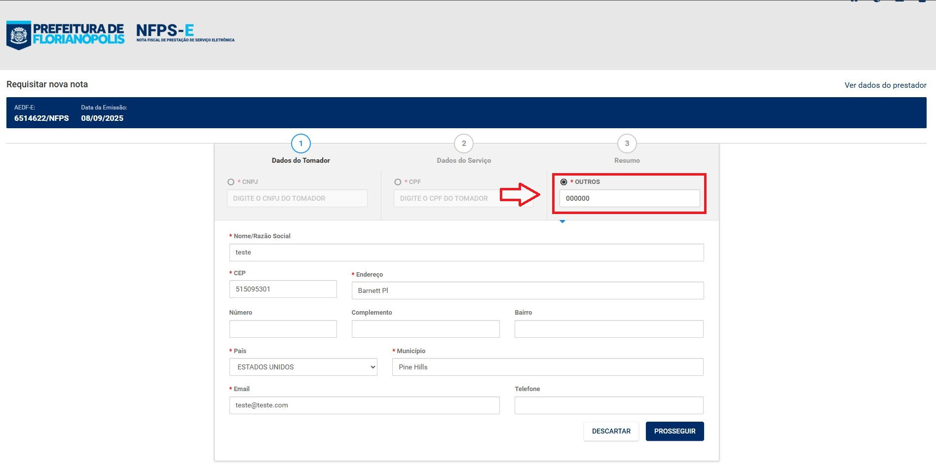 Os campos com o asterisco são obrigatórios, lance conforme os dados do contratante do serviço.