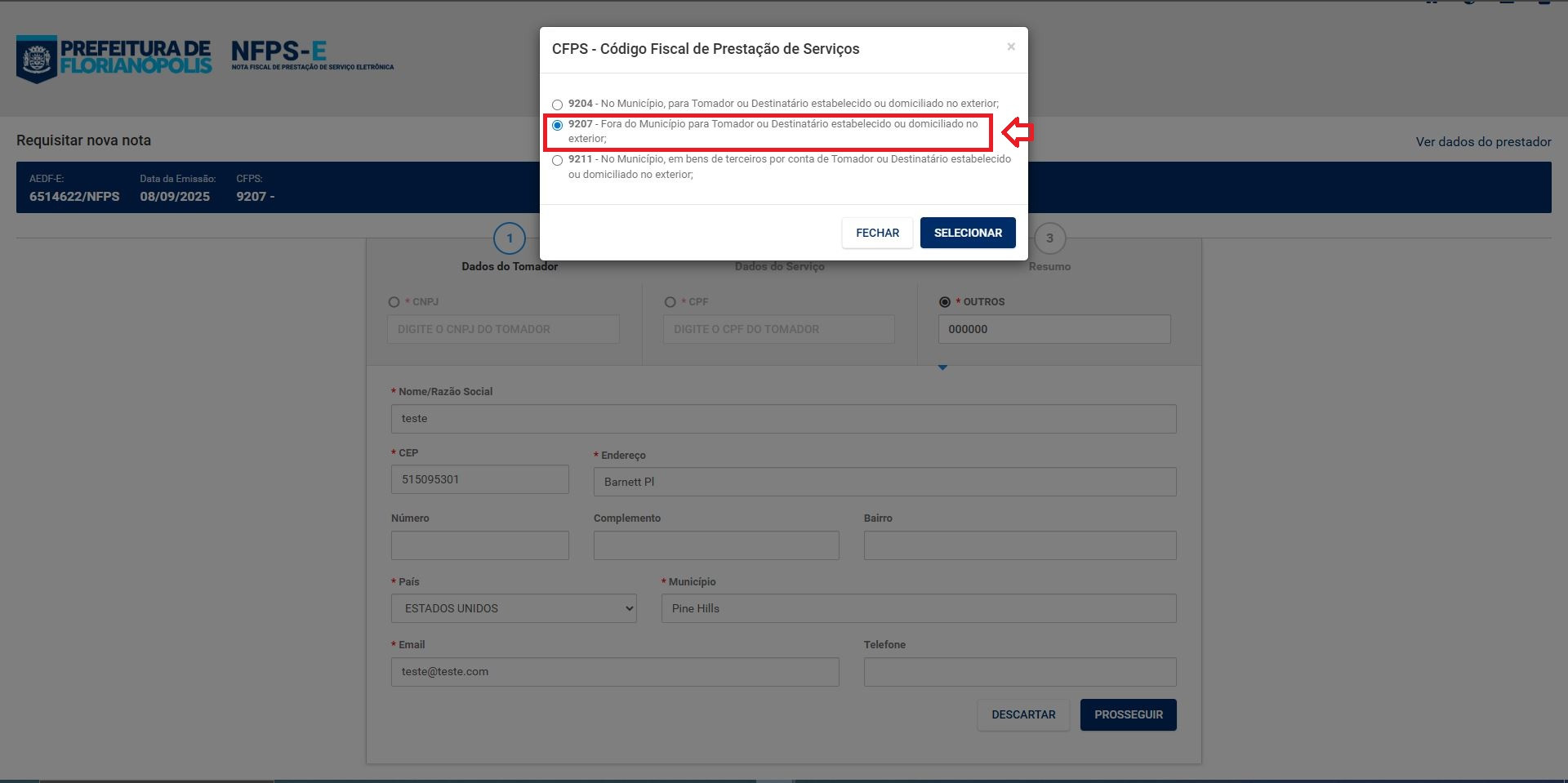 8- Ao prosseguir, selecione o código de prestação de serviço equivalente a domiciliado no exterior.