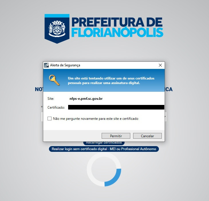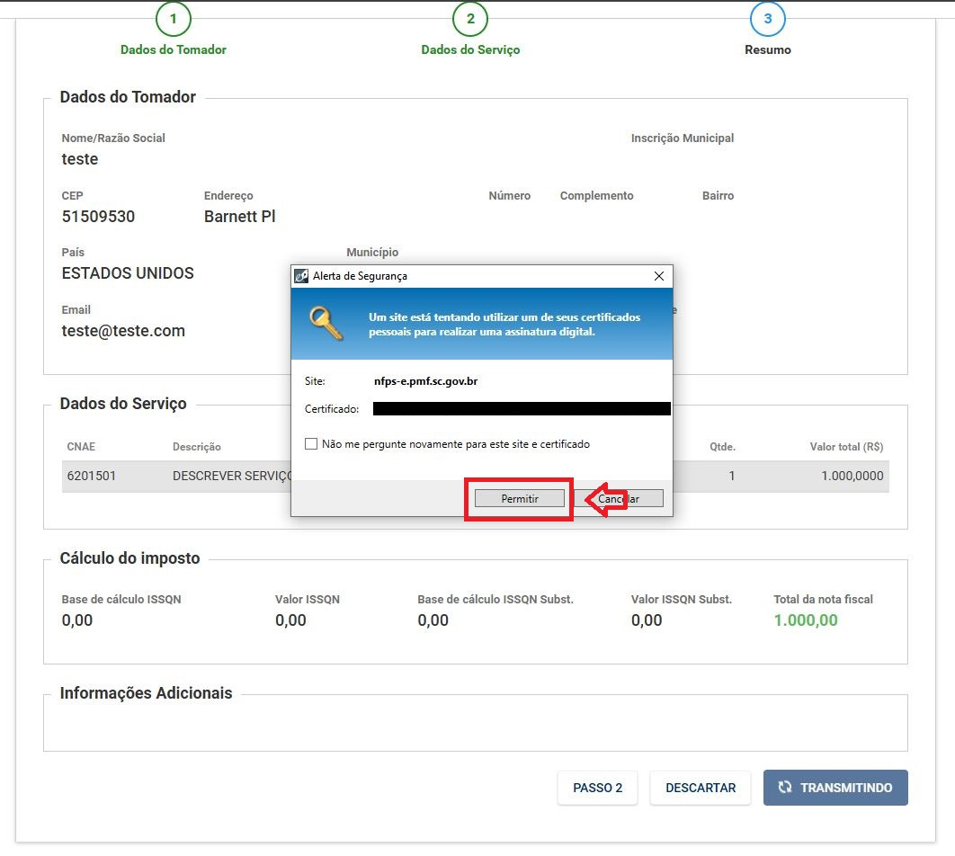 13- Ao transmitir, o sistema pedirá para confirmar o uso do certificado. Clique em permitir.