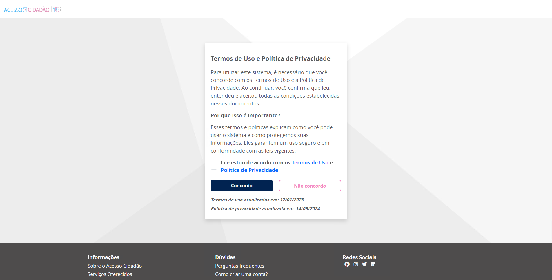 Caso seja a primeira vez acessando, terá que aceitar os termos do portal.